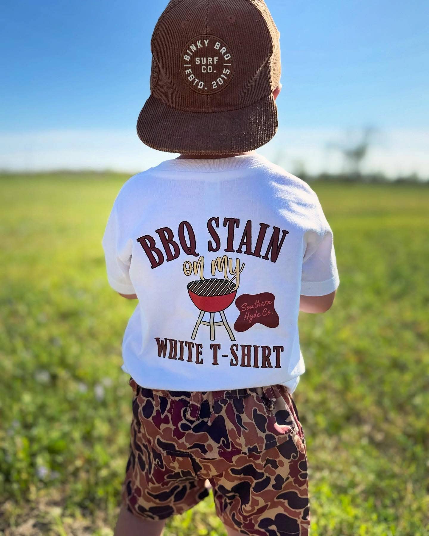BBQ Stain. All our items are Direct to Film printed. All our infant/toddler/ youth tees are printed on 100% Cotton tees, brand Rabbit Skins/LAT.